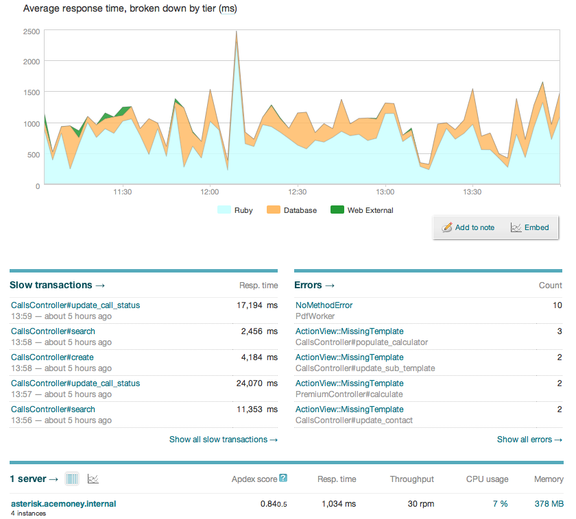 The system is hosted in a private data center – with nginx + passenger setup. It runs on Rails 2.3.11 + MySQL and uses Thinking Sphinx for search indexing. It has been running fine for the past 3 years and over the last few months the client has scaled number of users considerably but nothing that we found alarming.