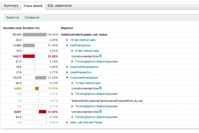 Hang on — Uninstrumented time – wtf! RPM says its the time spent where we cannot analyze where the control went. We add tracer_method to thinking sphinx methods (ThinkingSphinx::Search showed up) but we still got uninstrumented time. Now what more tracer methods could be add? !! Having limited options here, we dug into various gem code.