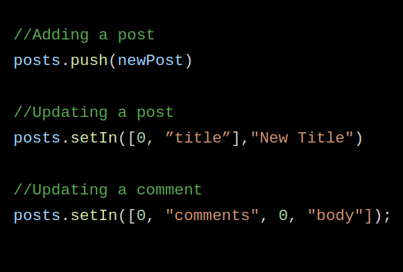 When you’re using Immutable.JS, it will always return a copy when you update the data and share as much of the old structure as possible. The same actions that we performed above become much shorter with Immutable.JS. However, these aren’t regular Javascript objects and need to be converted back and forth to work with APIs and 3rd party libraries.