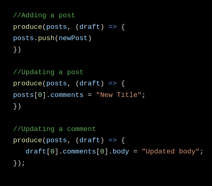 1. In terms of ease of use, Immutable.JS does have it’s own syntax which isn’t very difficult to use. Immer uses the same syntax as native Javascript — which works really well. Natively maintaining immutability can become convoluted very quickly as we saw.