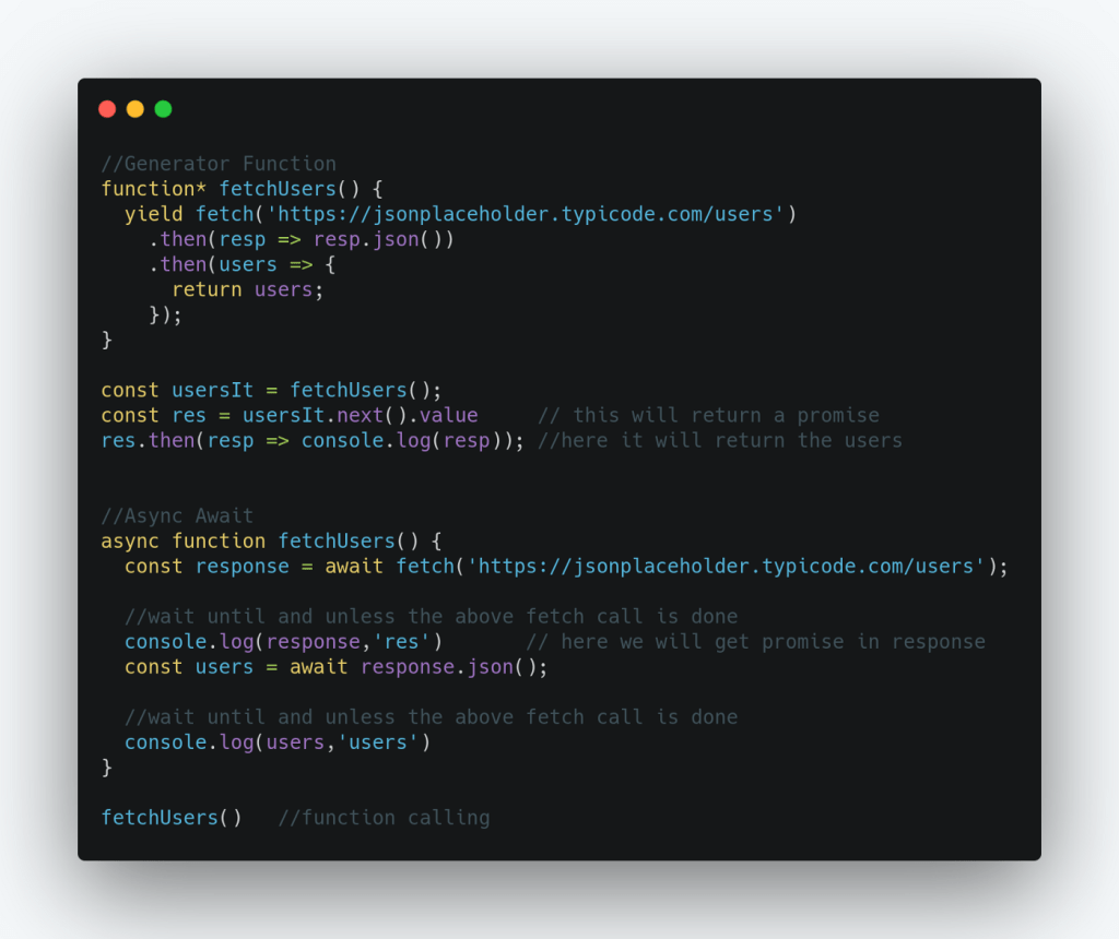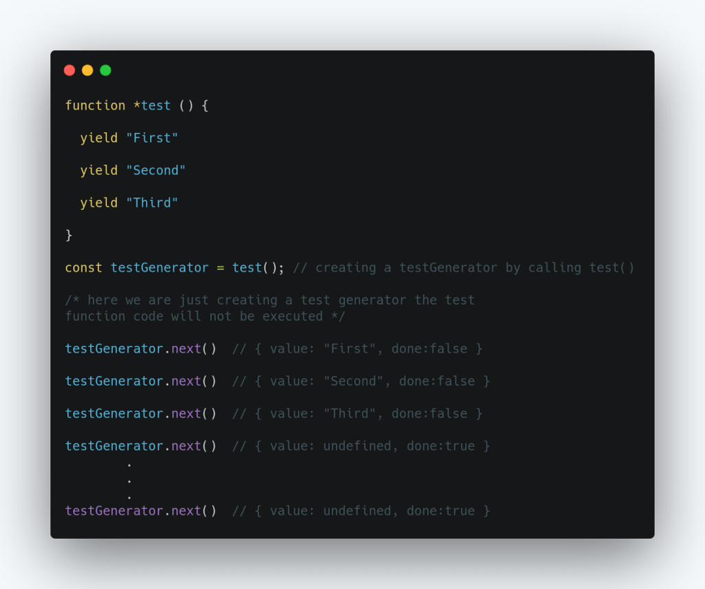 In short, we can say, It is used for maintaining the sequence of execution like we do a similar thing using callback or promise or async-await. Iterator allows us to execute the lines one by one using the ‘next()’ method.