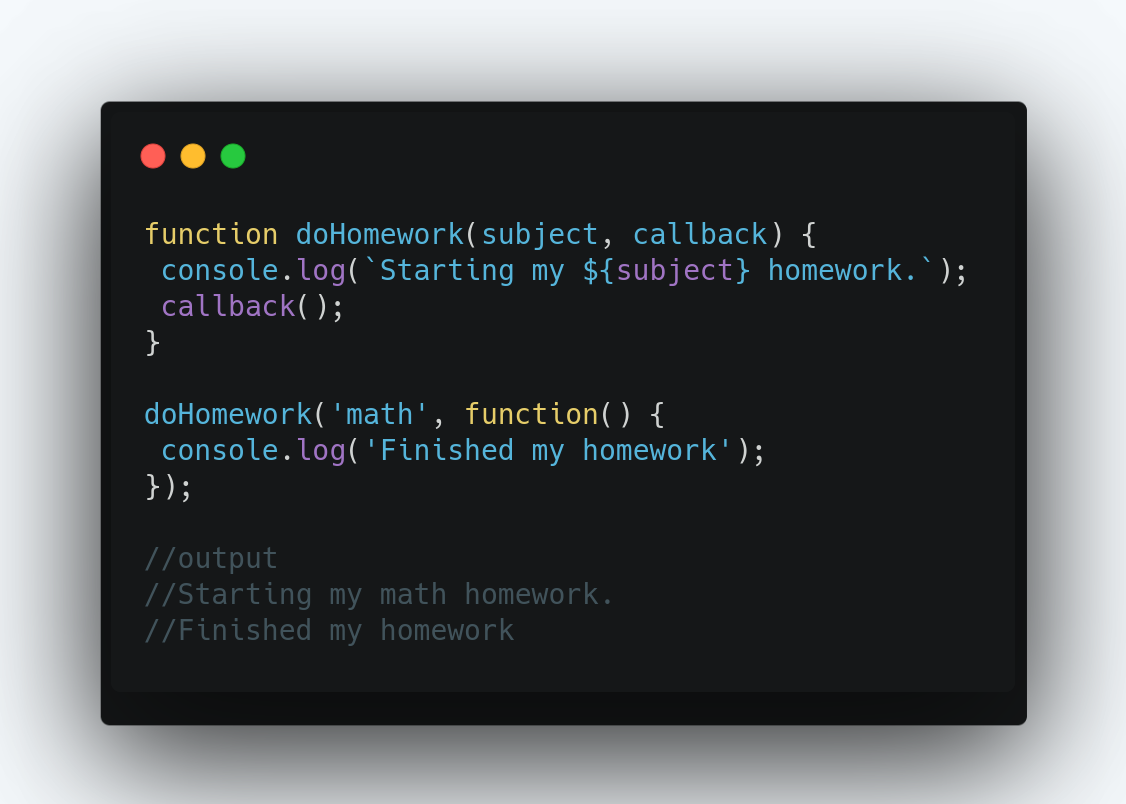 In the above example, we want to start console output and then finish console output, so we are passing one function as a parameter to another function and executing it in that function.