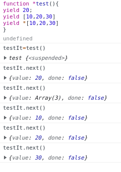 In the given example you can see, we can assign any value to yield which we want back while we are calling the next method. here we have passed a simple array and also passed * with an array, both work differently if we give array with * it consider like bellow.