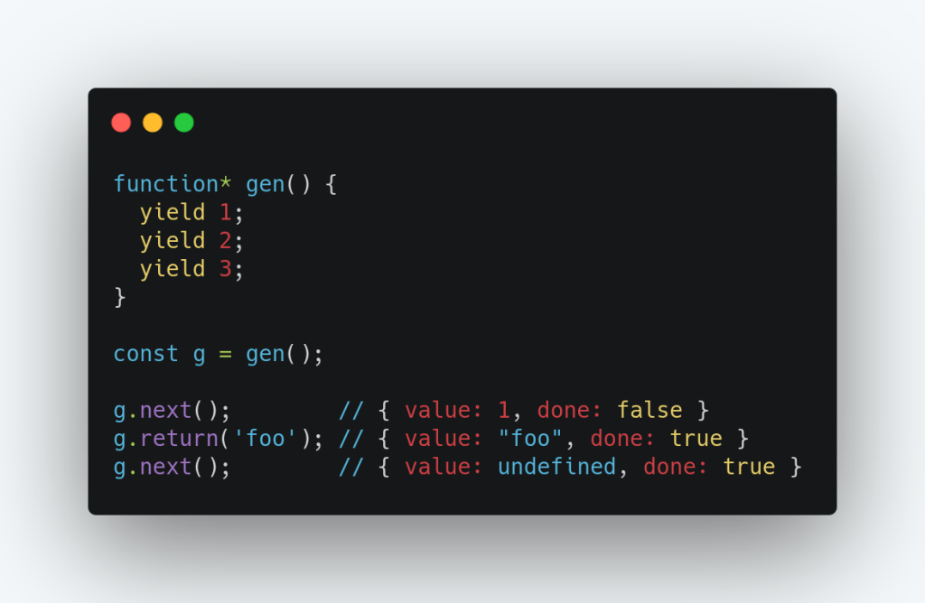 3) Return :-> A return statement in a generator, when executed, will make the generator finish (i.e. the done property of the object returned by it will be set to true ). If a value is returned, it will be set as the value property of the object returned by the generator.