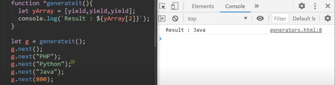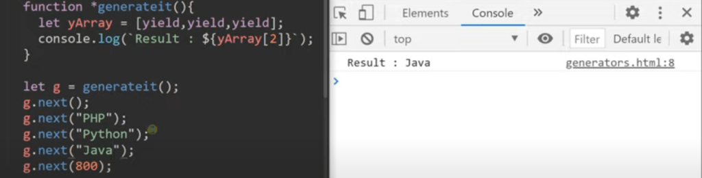 In the given example, we are passing value through the next method and as a result, we are getting all the values that we have passed like we can use generator function in many more ways.