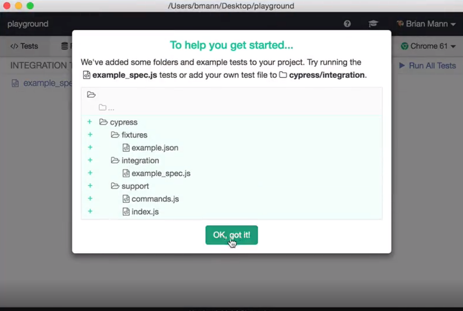 With this command, we can open the folder structure for cypress inside that some tests are already written