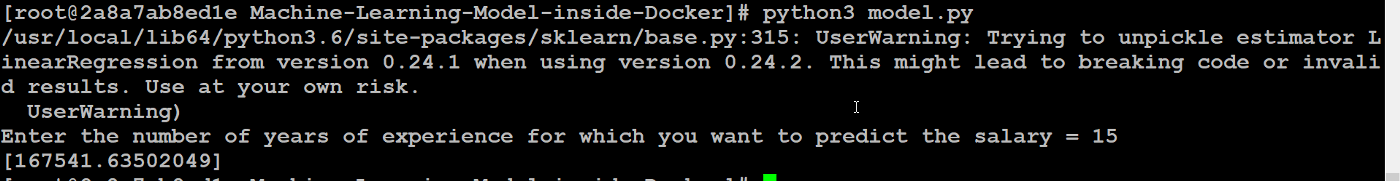 Run the python file and here as you can see, my machine learning model is working perfectly fine and predicting the result for 15 years of experience.