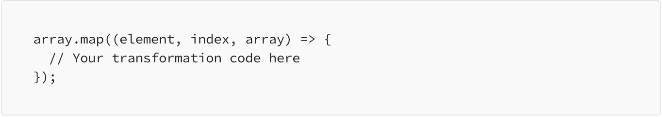 The array.map() function in JavaScript is a powerful method used to apply a transformation to each element of an array, resulting in a new array with the transformed values. It’s particularly useful for processing or displaying data in the array. Following is the basic syntax of it.