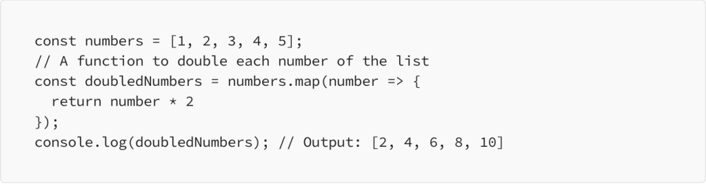 Using map(), we create a new array, doubledNumbers, where each number is multiplied by 2 so the output is [2, 4, 6, 8, 10].