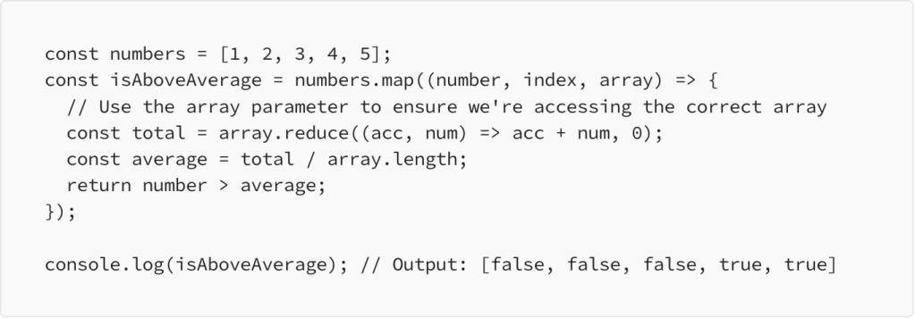 Performance: While there’s minimal performance impact, avoiding unnecessary calculations inside map() by reusing pre-computed values (e.g., a known average) can be more efficient.