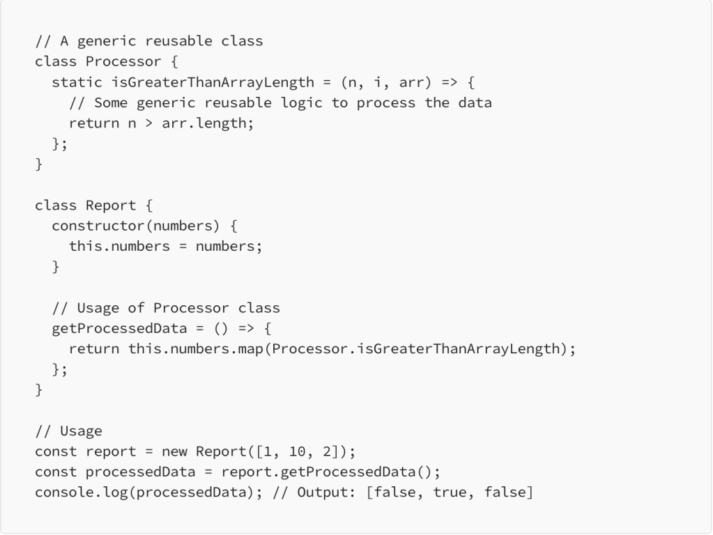 Re-usability: By using the array parameter, the Processor class remains modular and reusable. It can be applied to any array passed to it via map(), regardless of the context or the specific array variable name used in the Report class.