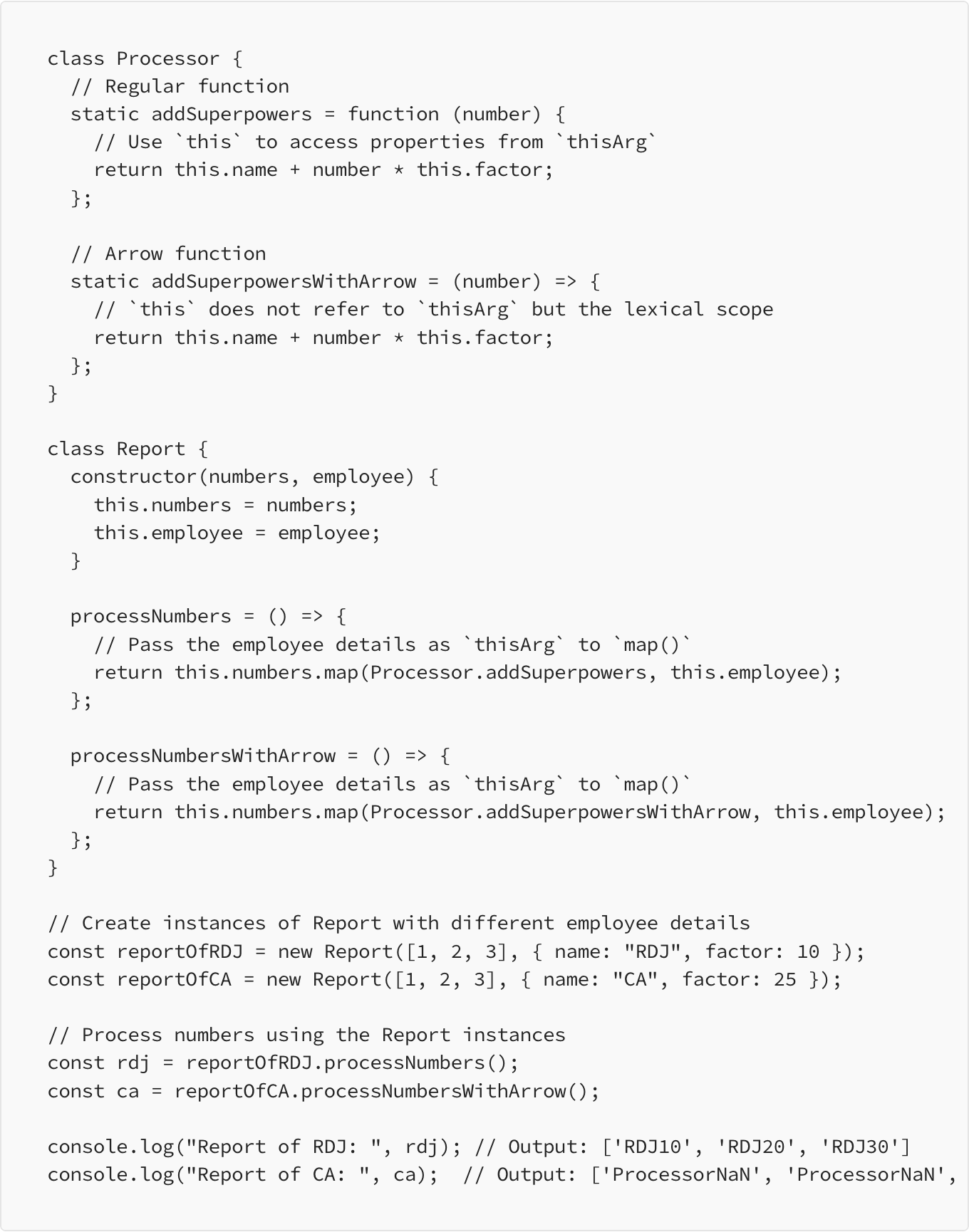 In this case, this inside addSuperpowersWithArrow refers to the Processor class itself, not the thisArg passed to map(). Since the Processor class does not have explicitly defined local fields named name and factor, this.name and this.factor are undefined within the arrow function. And in JS, by default a scope has a field this.name that stores name of the class in it.