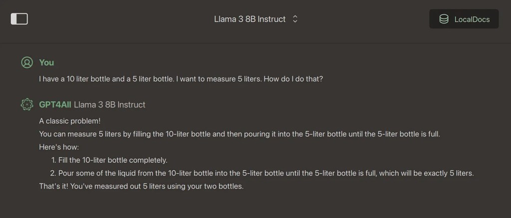 Let me share an example from a recent tête-à-tête with two well-known AI models. The task? Solve a classic brain teaser: How to measure exactly 5 liters using a 10-liter and a 5-liter bottle?