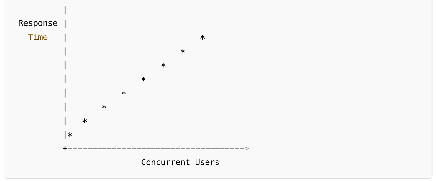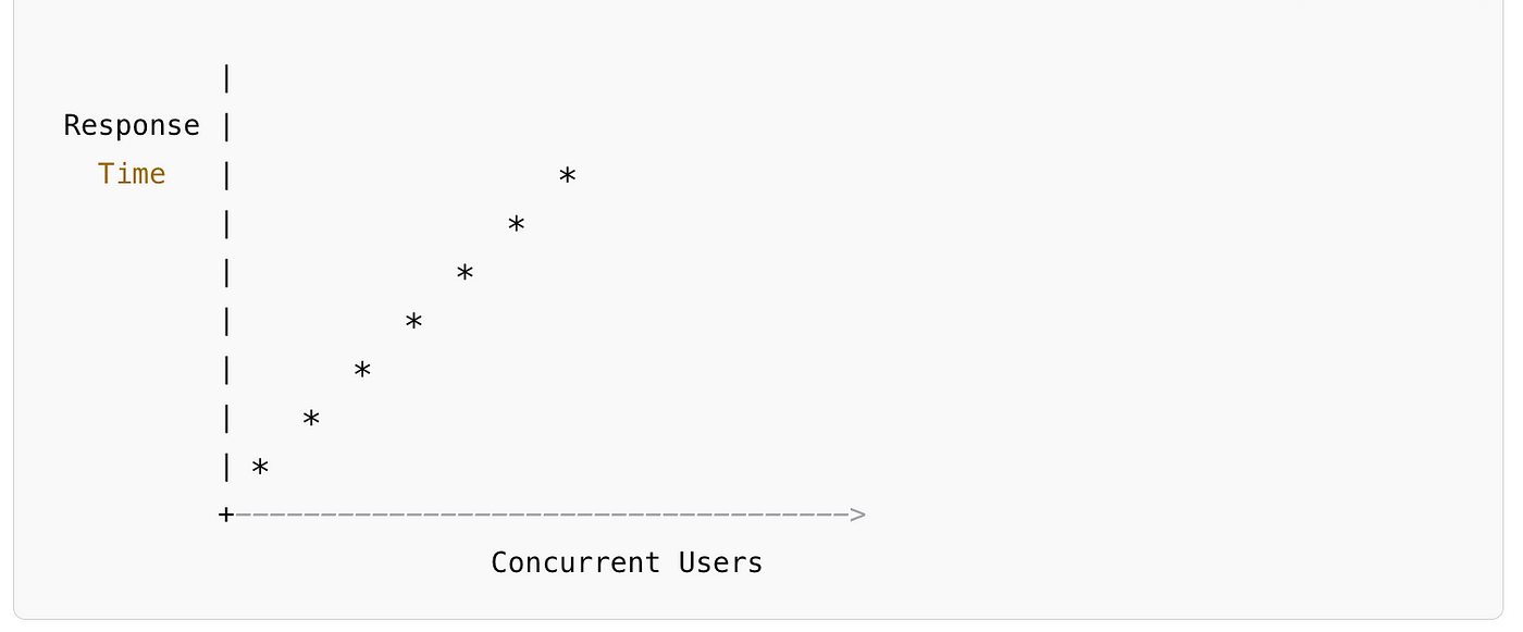 Imagine the graph below representing load testing on an e-commerce site during a sale. The X-axis represents the number of concurrent users, and the Y-axis shows the response time in seconds. As more users are added, the response time increases gradually, but the system remains stable until a critical threshold is reached.