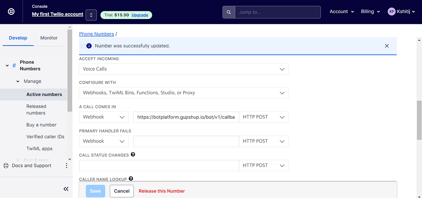- In the left sidebar, click on Phone Numbers → Manage Numbers.