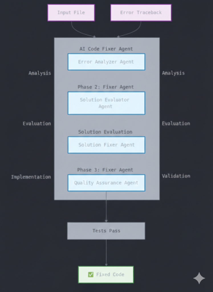 Imagine you could hire a team of expert assistants, each laser-focused on one job, but capable of passing their findings seamlessly to the next person in line. One assistant monitors error logs 24/7 and never gets tired. Another evaluates every possible fix and scores them by risk. A third actually writes the code change. A fourth runs the tests to make sure nothing breaks.