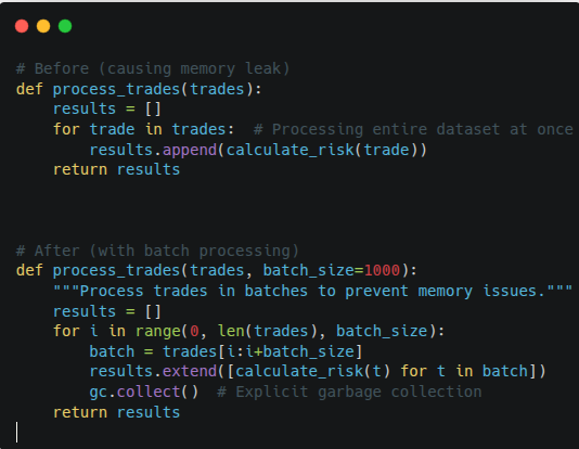 This code change replaces a memory-intensive, linear process with a batch-processing strategy to ensure system stability during high-volume trading. By breaking down large datasets into manageable chunks and incorporating explicit garbage collection, the updated function prevents the “Before” version’s tendency to crash under load. This directly addresses the scalability bottleneck mentioned in your problem statement, moving from a fragile, spreadsheet-style logic to a robust, production-ready implementation that preserves memory and prevents operational downtime.